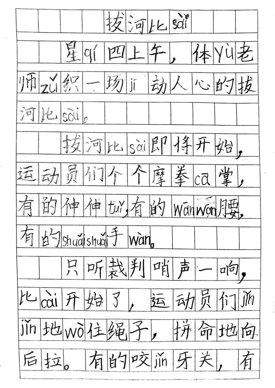 隨著裁判的一聲哨響,比賽正式開始,雙方隊(duì)伍緊握繩索,展開激烈角逐,小明咬緊牙關(guān),拼盡全力拉拽繩索,他的眼神堅(jiān)定而執(zhí)著,賽場(chǎng)旁,觀眾們的加油聲、吶喊聲此起彼伏,在這場(chǎng)比賽中,小明和他的伙伴們展現(xiàn)出了頑強(qiáng)的拼搏精神和團(tuán)結(jié)的力量。