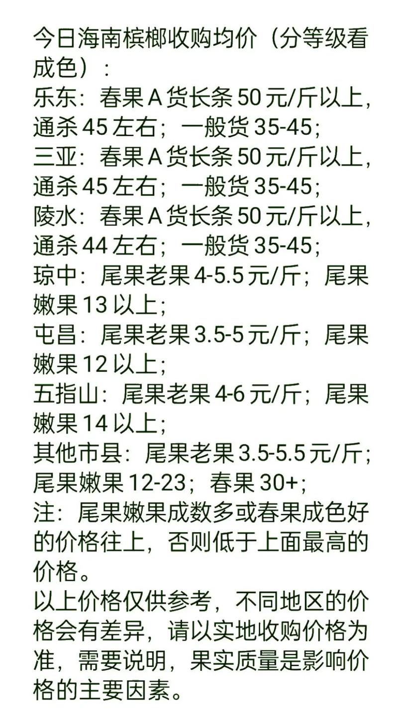 4、市場(chǎng)需求:市場(chǎng)需求也是影響檳榔價(jià)格的重要因素,當(dāng)市場(chǎng)需求增加時(shí),檳榔價(jià)格一般會(huì)上漲;反之,則可能下降。